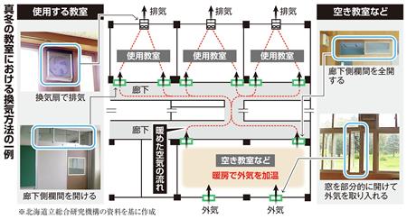 新型コロナウイルスの感染再拡大で、さらなる状況悪化が懸念される冬本番に向け、学校現場は今、寒さに配慮しつつ教室の換気を適切に行うという難題を突き付けられている。特に寒さが厳しい地方で窓を開けるとなれば、授業に支障をきたしかねない。室温管理と換気の両立が必須となる中、北海道では空き教室で取り入れた外気を暖めて校内に行き渡らせることにより、空き教室そのものを“暖房装置”として活用する妙案も登場している。(福田涼太郎) 「換気の時間を計りながら授業をするのは教員の負担だ。窓を開ければ寒さに耐えたとしても子供の集中力は途切れる。それに窓が凍り付いたら開かない」 真冬には氷点下20度に達するオホーツク海に面した北海道紋別(もんべつ)市。市教委の担当者は厳冬期に教室の窓を開けて換気することの難しさを説明する。 換気では新しい空気を取り入れるだけでなく、教室内の古い空気を外に出す必要がある。窓を開けての換気が困難と判断した同市は冬に備え、小中学校の各教室に換気扇を設置することを決定。年内の完了を目指して工事を進めている。 設置後は廊下の窓を開けて外気を取り入れ、扇風機を使って教室の廊下側の壁上部にある小窓(欄間)を通じて教室内に流し込み、古い空気は換気扇から排出する。教室内の屋外側の窓を開けることは避けられるが、廊下側から少量ながら冷たい空気が常に入ってくるため、「多少、寒くはなる」(担当者)と話す。 文部科学省が示した新型コロナ対策のマニュアルでは、換気について「気候上可能な限り常時、困難な場合はこまめに(30分に1回以上、数分間程度、窓を全開する)、2方向の窓を同時に開けて行う」ことを求めている。 今夏は猛暑の中で窓を開けて換気をすることに熱中症などの懸念が向けられた。文科省の担当者は「夏よりも冬の方が外気と室内の温度差が大きい」と冬場の難しさを指摘。ある程度、暖房の温度や服装を調節することで対応できるものの、子供によっては体調を崩す恐れもある。 また、設置が進んでいる暖房とは異なり、換気設備は設置を義務付けた平成15年7月の改正建築基準法施行前に建てられた学校では整備が進んでいない可能性がある。換気扇がなければ「窓をこまめに開ける」ことを余儀なくされる。 北海道教育委員会は今月19日、道内の各教委などに「北海道の冬季の寒さに配慮した学校の換気方法」と題する資料を提供。その中で換気扇の有無別に方法を紹介している。 換気扇がある場合は、空き教室や授業を行っていない特別教室の窓を開けて外気を取り入れ、暖房をつけて空気を暖める。廊下を通じて暖めた空気が校内をめぐり、欄間から使用中の教室内に流れ込み、古い空気は換気扇から屋外に排気され続けるという仕組みだ。複数の空き教室を使えば、それだけ寒さが和らぐ。 換気扇がない場合も同様の流れだが、校舎の延べ面積や在校者の年齢層、人数など条件別に必要な換気量を割り出し、教室の窓や扉の開け幅の目安を細かく提示。窓を開ける際には外からの気流が人に直接当たらないよう衝立を活用することも提案している。 資料を作成した道立総合研究機構建築研究本部の担当者は「換気扇があるパターンの方法であれば、そのまま他の地域でも取り入れられる」と説明。文科省は近く新型コロナの対策マニュアルを改訂する予定で、こうした真冬の換気方法の参考情報も提供する。