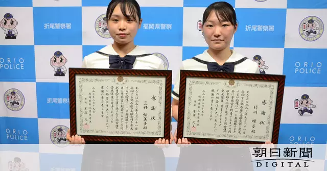 屋外にいた認知症とみられる高齢女性に寄り添って人命救助に貢献したとして福岡県警折尾署は8月19日、北九州市八幡西区の自由ケ丘高の竹川瞳子さん(3年)と三好絵美子さん(同)に感謝状を贈った。