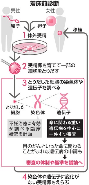 着床前診断は、体外受精させた受精卵の遺伝子や染色体を調べる。遺伝性の病気などを受精卵段階で知ることができるが、病気や障害のある人の排除につながるという批判もある。