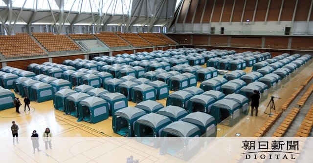 メインアリーナには、広さ約4平方メートル、高さ約2メートルのテントが231個並べられた。中では大人2人までが過ごす想定で、マットや毛布を用意。新型コロナウイルスやインフルエンザの感染者が過ごす別室も設けた。看護師が24時間常駐する。