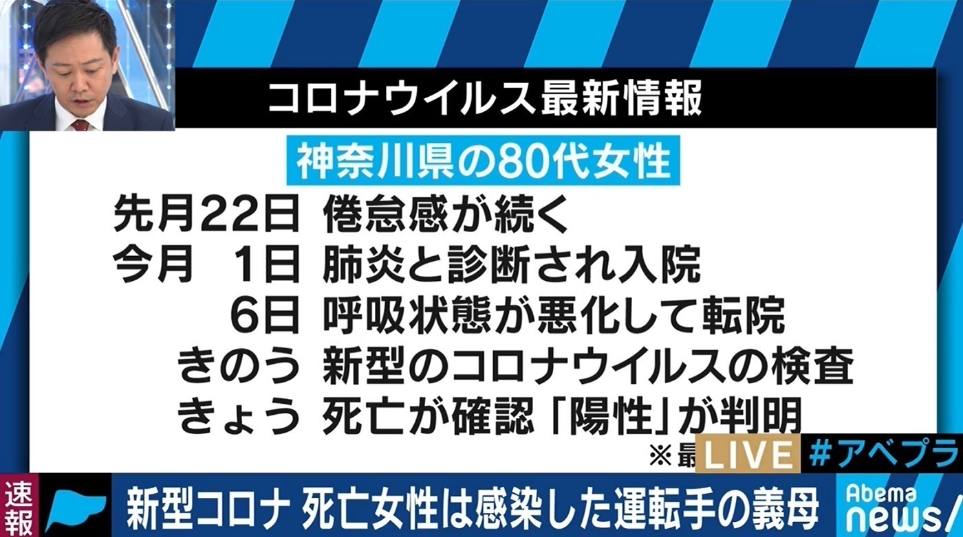 13日に肺炎が悪化して亡くなり、新型コロナウイルスへの感染が確認された神奈川県の80代女性が、新たに「陽性」が判明した東京都のタクシー運転手の70代男性の義理の母であることが関係者への取材でわかった。今のところこの2人に接点があったかなどについてはわかっていない。