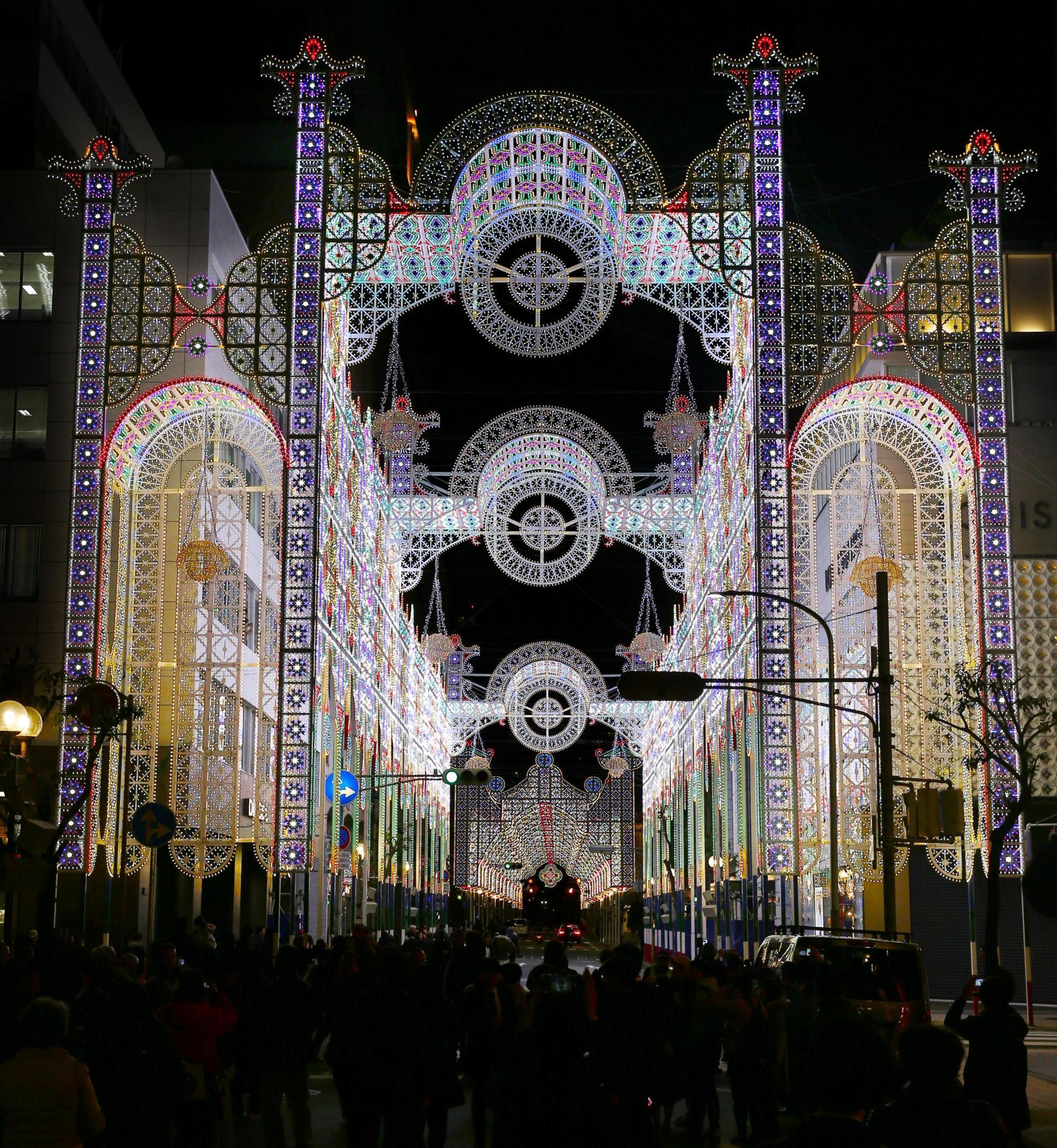 主催者によると、発光ダイオード(LED)の電球など約50万個を使用。旧外国人居留地には約270メートルにわたって14基のアーチと、1回目の作品を再現した白熱電球の装飾を設置した。また公園「東遊園地」では初めて、ガス灯「1.17希望の灯り」を覆うように高さ4メートルのアーチを置いた。