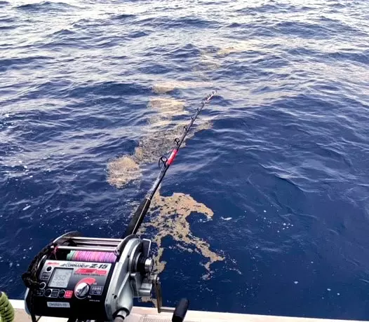 午前6時ごろに島の南西70キロあたりで漁を始めると、大量の細かい軽石が天の川のように帯状になってゆらゆらと近づいてきた。気づけばあちこちに固まりが浮いている。キンメダイは水深約600メートルまで仕掛けを下ろして釣り上げる。軽石をよけたくても船はすぐには動かせないが、なんとかかわした。