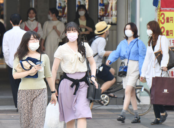 街中や公園などでは新型コロナウイルス感染症への対策として、マスク姿で買い物や散策を楽しむ人の姿が見られた。気象台は、晴れて気温が上がる日にマスクを着用する場合、熱中症への注意を呼び掛けている。(具志堅聡)