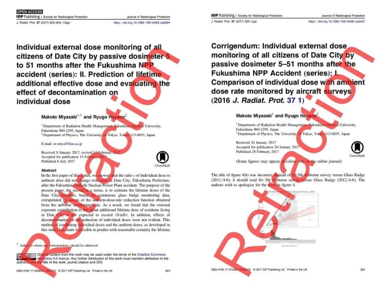 「論文撤回という結果になったことは誠に残念と受け止めています」。福島県立医大は撤回を受け、文書でコメントを発表した。宮崎氏の博士号の学位を取り消したことも明らかにした。 ▽同意なきデータ 伊達市は福島県北部の農村都市で、事故があった第1原発の北西約60キロに位置する。事故で飛散した放射性物質は同市にも及び、一部地域は放射線量が年間20ミリシーベルトを超えると推定され「特定避難勧奨地点」の指定を受けた。市は健康管理対策として、全住民を対象に「ガラスバッジ」と呼ばれる個人線量計を配布。15年8月、ガラスバッジで事故後の11年~15年に測定した住民の被ばく線量の解析を著者側に依頼した。市が住民のデータを提供した際、データの使用に「不同意」と回答した人や同意書を提出していない人の分が含まれていた。 周知なく発表された論文に住民の一人が疑問を持ち、市へ情報開示請求を始めたことから、問題が発覚し、市議会も追及。データの提供経緯を検証する市の第三者委員会の調査で、市職員が著者側に渡した約6万5千人の外部被ばくデータのうち、約3万4千人はデータ利用の同意がなかったことが判明した。第三者委は20年3月、「個人情報の取り扱いに対する意識を著しく欠いていたことに加え、管理体制が不十分だった」ことが原因とする報告書をまとめた。