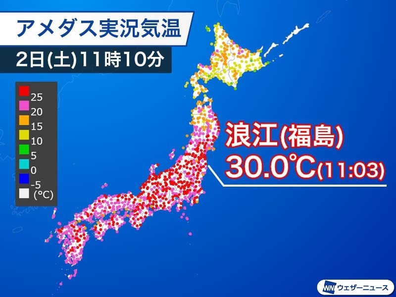 今日5月2日(土)も西日本から東北にかけて高気圧に覆われ晴れています。気温は昨日以上に上昇し、福島県浪江では30℃を超える真夏日になりました。