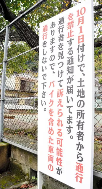住民によると、私道の所有者が昨年11月、福岡県の不動産管理業者に変更。業者は住民に夏ごろから、月額「1世帯1万円」「車所有なし3千円」「自動二輪のみ所有5千円」などの通行料を住民に請求。9月下旬には「通行料の支払いがされない場合、10月1日から一般車両の進入を禁止する」との連絡があり、「不法に進入された場合には、法的対応を取る」との通知書が届いたという。