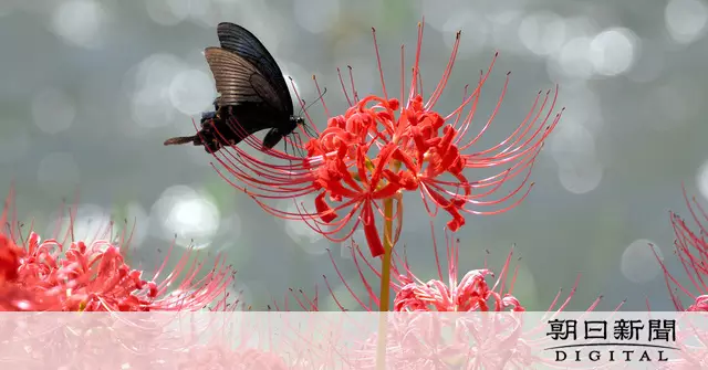 福岡県宮若市の犬鳴川河川公園でヒガンバナが見頃を迎え、訪れた人たちの目を楽しませている。