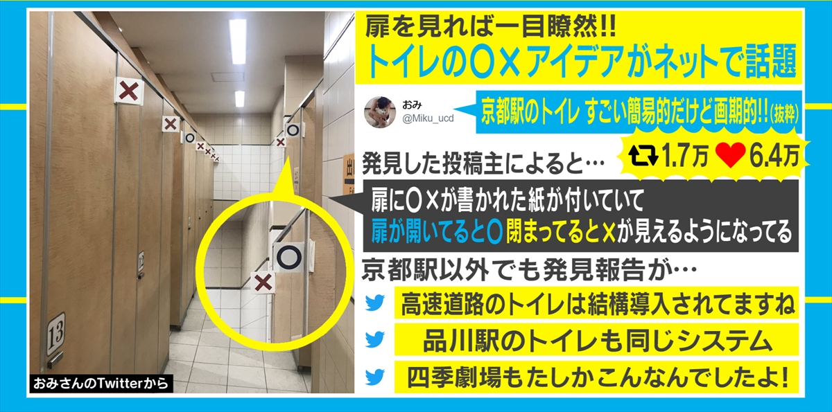 それは京都駅のトイレが「扉に○×が書かれた紙が付いていて、扉が開いていると○ 閉まっていると×が見えるようになってる」というもので、Twitterでは「高速道路のトイレは結構導入されてますね」「品川駅のトイレも同じシステム」「劇団四季もたしかこんなんでしたよ!」と他の場所での目撃情報も多く寄せられた。