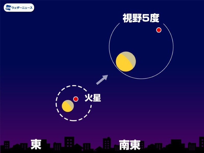 8月9日(日)の深夜から10日(月)の明け方にかけて、南東の空で月齢19の下弦前の月と火星が接近して見えます。 地球との最接近を2か月後に控えた火星はマイナス1.3等級まで明るくなり、赤っぽい色もいっそう目立つようになっています。 日付が変わるころには30度ほどの高さまで上っているので、夜更かしの人々の目を引く光景となりそうです。視直径は16秒角ほどまで大きくなっていて、天体望遠鏡での観察も楽しみも期待できます。次回の接近は9月6日(日)から7日(月)です。