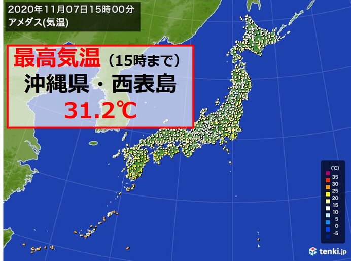 7日は二十四節気の「立冬」で、暦の上では冬の始まりですが、南はまだ夏の暑さです。沖縄県西表島の上原や、名護市などでは、最高気温が30℃以上の「真夏日」になりました。また、鹿児島県枕崎市や、宮崎市などでは、最高気温が25℃以上の「夏日」になりました。