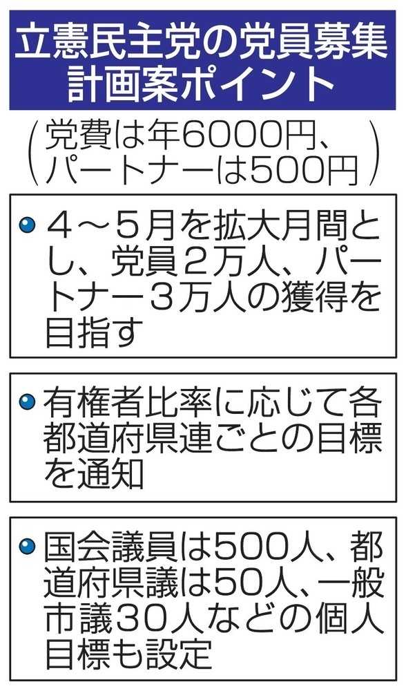 立憲民主党が4月から本格的な党員獲得に乗り出す。政権奪取には集票基盤の強化が不可欠と判断した。現状は年500円で党活動へ参加できる「パートナー」が主体だが、年6千円で代表選の投票権を付与する党員の大幅増を目指す。まず5月までを集中期間とし、2万人の獲得を目標とする案を検討している。党関係者が14日、明らかにした。