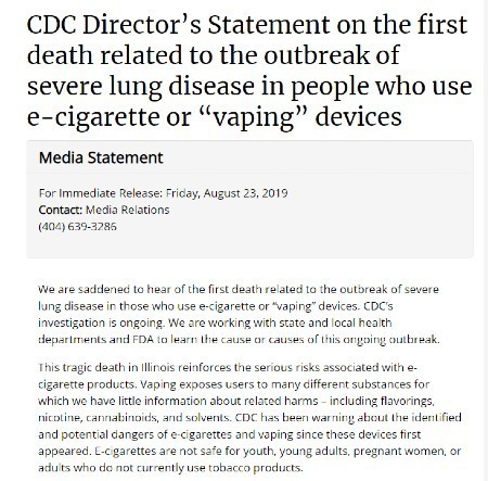 死亡例はイリノイ州で報告。死亡者は最近電子タバコを使用し、重度の呼吸器疾患で入院したあと死亡したと州当局は発表しています。同州では過去1週間で、電子タバコを使用し、呼吸器系の疾患で入院した患者の報告数が倍増したといいます。