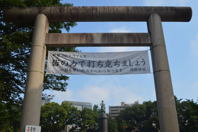 皇居の近く、東京都千代田区にある靖国神社の境内で、拝殿に至る内苑の「神門」が開くのは午前6時です。間に合うよう地下鉄で九段下駅に着き、明け方の坂を上ると大鳥居(第一鳥居)に着きます。高さ25メートル。ここから神社の外苑になります。 境内の木々から降り注ぐせみ時雨の中、100メートルほど行くと中央広場です。高々とした台座には大村益次郎の銅像。明治維新を経て歩み始めた近代国家・日本で軍隊創設に尽くしたことで知られますが、靖国神社の創設にも深く関わっています。 靖国神社の由来は1869(明治2)年に遡ります。戊辰戦争で大村も加わった官軍に多くの死者が出て、明治天皇が慰霊のためこの地に「招魂社」を設立。1879年に靖国神社と改称されました。 以来、第二次大戦に至るまで「国を守るために尊い命を捧げられた246万6千余柱の方々の神霊が、身分や勲功、男女の別なく、すべて祖国に殉じられた尊い神霊(靖国の大神)として斉しくお祀りされています」(靖国神社「参拝のしおり」)。 まだ午前6時前で、参道に人はまばらです。横断歩道を渡り第二鳥居をくぐると神門(しんもん)ですが、まだ閉まっています。直径約1.5メートルもある金色の菊の紋が二つ並ぶ両扉の前で、百人ほどが待っていました。 もうすぐ開門なので撮影しようと神門に近づいていくと、「おい、朝日新聞」とそばで大きな声がしました。