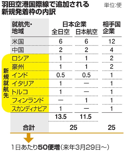 国土交通省は2日、2020年3月から増える羽田空港の国際線について、中国やロシア、インドなど8カ国・地域に計26便を割り当てると発表した。決定済みの米国の24便と合わせて、1日当たり計50の増便分がすべて決まった。日本の航空会社へは、全日本空輸に13・5便、日本航空に11・5便を割り当てる。