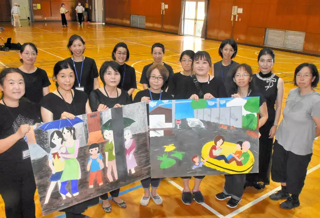愛知県清須市西枇杷島町の古城小。浸水の爪痕が壁に残る体育館で、11日、児童30人を前に紙芝居「忘れない!東海豪雨」が上演された。町内で8500人超の避難者が出たこと、家族でコップ1杯の水を分けたことなどを紹介しながら、「風化させず、未来へ語り継ごう」と訴えた。