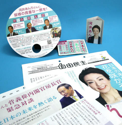 案里氏の陣営は公示前の政治活動として、案里氏と菅氏の対談内容などを紹介する大量の印刷物を県内各地へ送ったり、経歴などを記した顔写真入りのカードを街頭で大量に配ったりした。案里氏と安倍首相が並ぶポスターもあちこちに張られた。溝手氏など他陣営からは、これらの活動にかかる多額の資金の出どころをいぶかる声が出ていた。