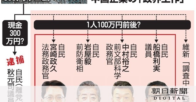 関係者によると、贈賄容疑で逮捕された中国企業「500ドットコム」顧問で元沖縄県浦添市議の仲里勝憲容疑者(47)が特捜部の調べに、衆院が解散した2017年9月28日に秋元議員に300万円を渡し、同じころ5人に「それぞれ100万円前後を渡した」と話しているという。特捜部は、この供述と符合するメモも押収している。