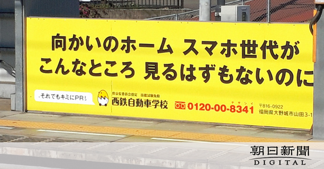 広告看板があるのは、福岡県筑紫野市にある西日本鉄道紫(むらさき)駅の下りホーム。黄色一色の看板に、「向かいのホーム スマホ世代が こんなところ 見るはずもないのに」と書かれている。左下に小さく「それでもキミにPR!」とけなげな言葉が添えられているが、何の誘い文句もない。