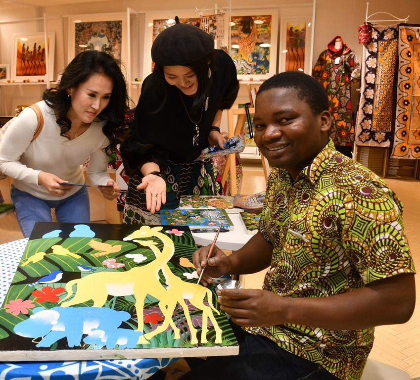 実演会では、画家のルーカスさん(32)が手作りのキャンバスに重ね塗りを繰り返しながら動植物を描写。はっきりとした輪郭とペンキの厚みで迫力のあるキリンや鳥が浮かび上がると、買い物客は興味深げに見入っていた。