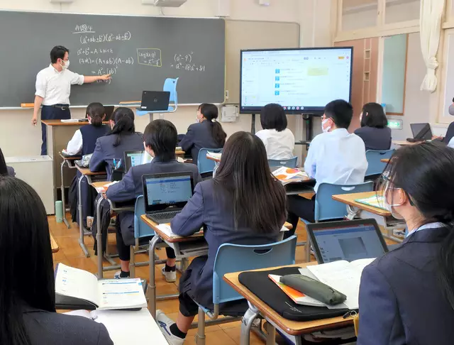 生徒は1人1台のノートパソコンを机の上に置き、教科書は開かず画面に表示された問題に取り組む生徒もいれば、自分や友達のノートの画像などを見ながら教員の解説を聞く生徒もいる。