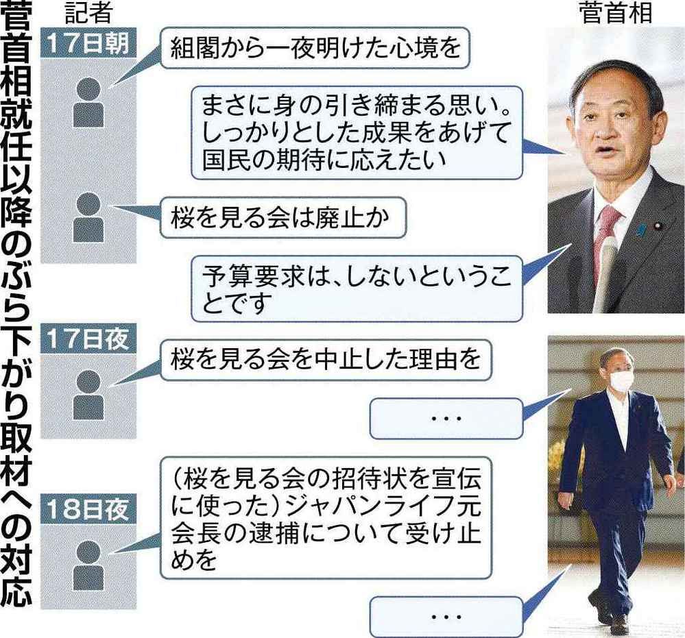 官房長官として毎日2回の記者会見をこなしていた菅氏は首相就任後、一夜明けた17日朝こそ心境を語ったが、その後は受け付けていない。 18日夜には記者から、逮捕された「ジャパンライフ」元会長が桜を見る会の招待状を宣伝に利用したとして受け止めを尋ねる質問が飛んだが、表情を変えず官邸を後にした。 また16日の就任会見では、30分間のうち15分を冒頭の説明に充て、質問希望者が残る中で打ち切った。 新内閣が発足して初の週末となった19日も首相は官邸に入った。日課だった散歩を敷地内で行い、20日予定の日米首脳電話会談に向けて外務省幹部らと準備。記者団の取材に答える場面はなかった。
