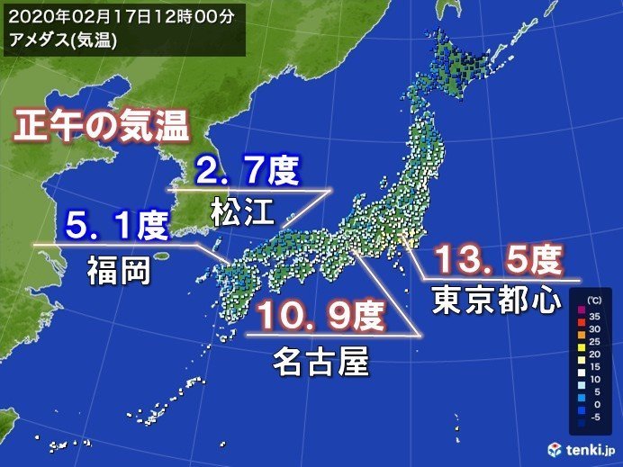 きょう(17日)は、日本付近に西回りで強い寒気が流れ込んでいます。正午の気温は、中国地方では5度に届いていない所があります。一方で、東海や関東では10度を超えている所が多くなっています。