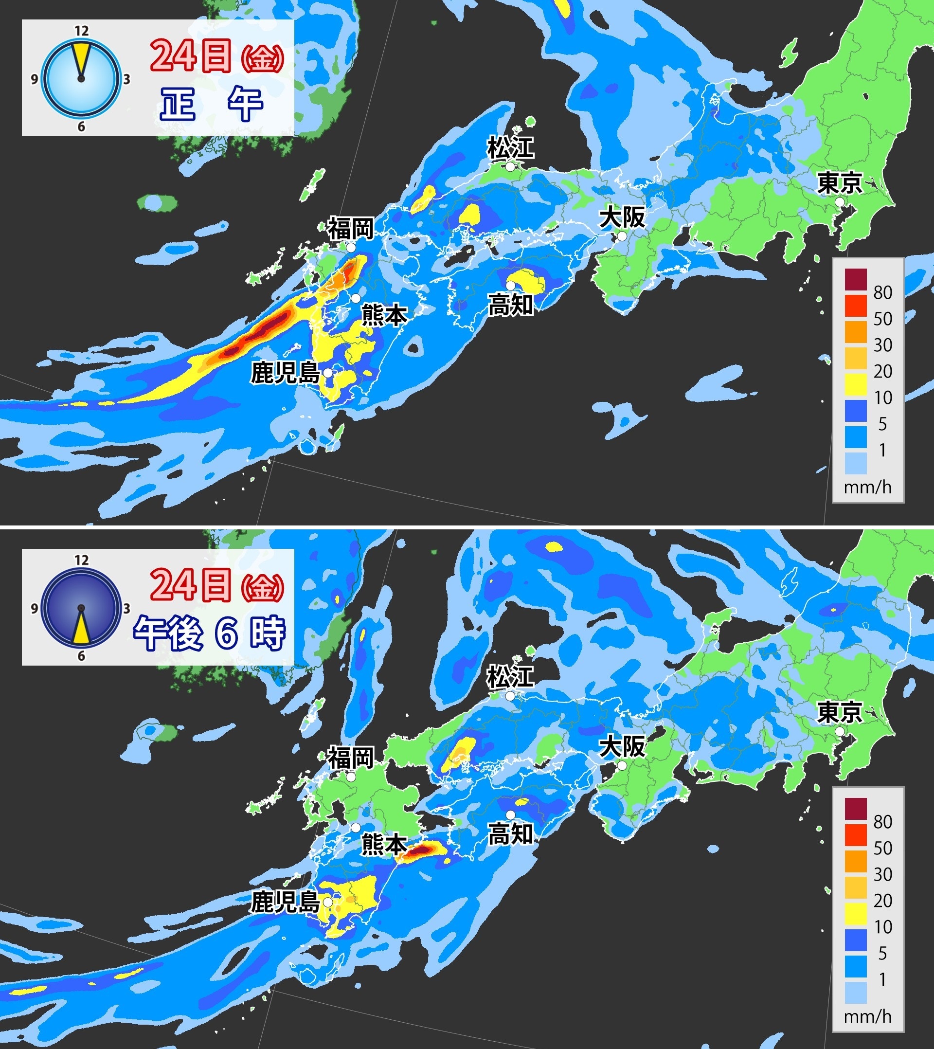 土砂災害に厳重に警戒し、低い土地の浸水、河川の増水や氾濫に警戒・注意が必要となる。