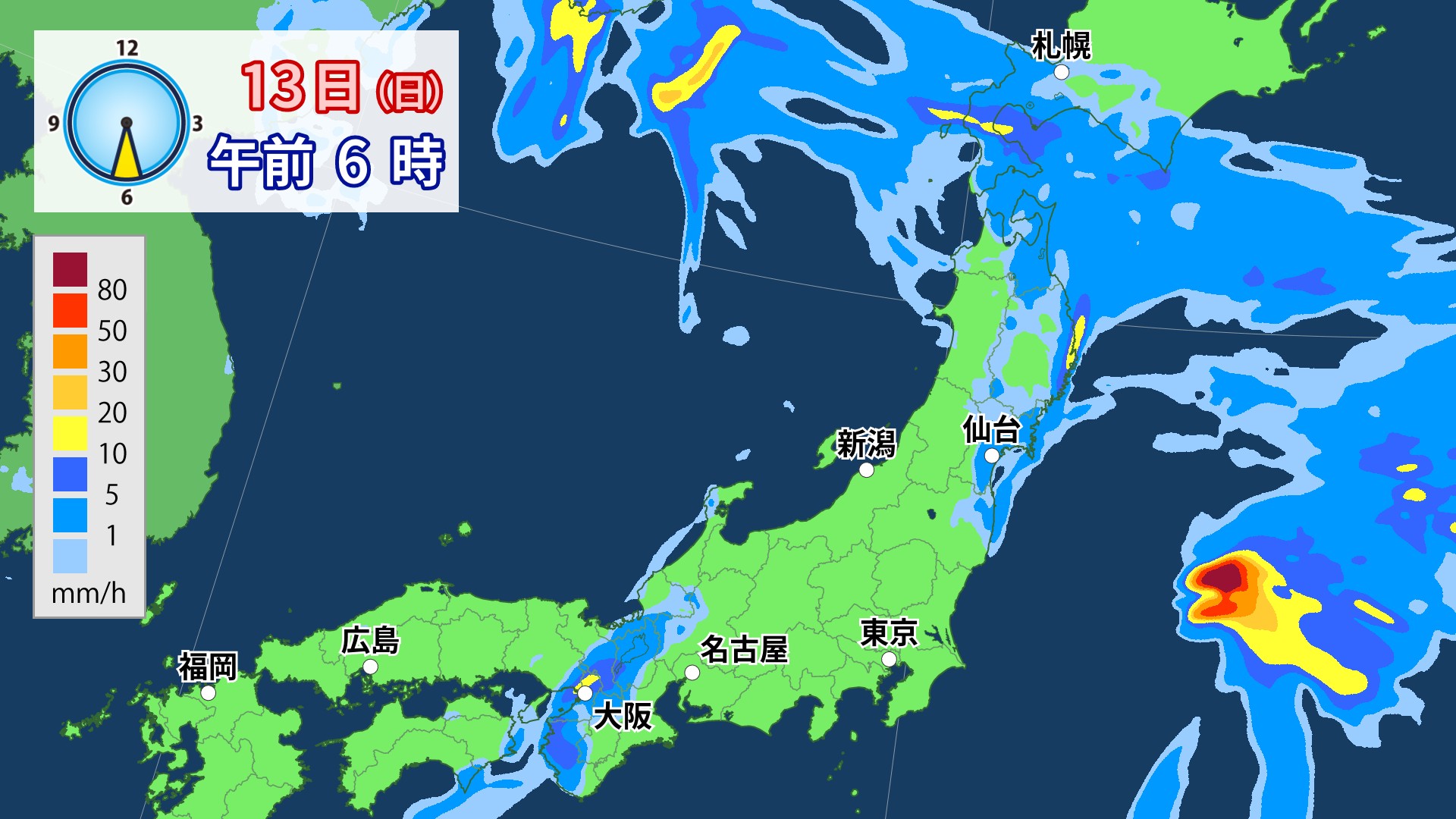 また、日本の南には熱帯低気圧があって北上している。前線や低気圧に向かって南から暖かく湿った空気が流れ込むため、西日本から北日本では13日にかけて大気の状態が不安定となる見込み。