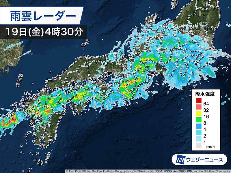 今日6月19日(金)は梅雨前線の活動が活発化していて、雨の強まっているところがあります。 未明から明け方にかけて、九州や中国地方の一部では、1時間に30mm以上の激しい雨が降りました。土砂災害や川の増水などに警戒するようにしてください。