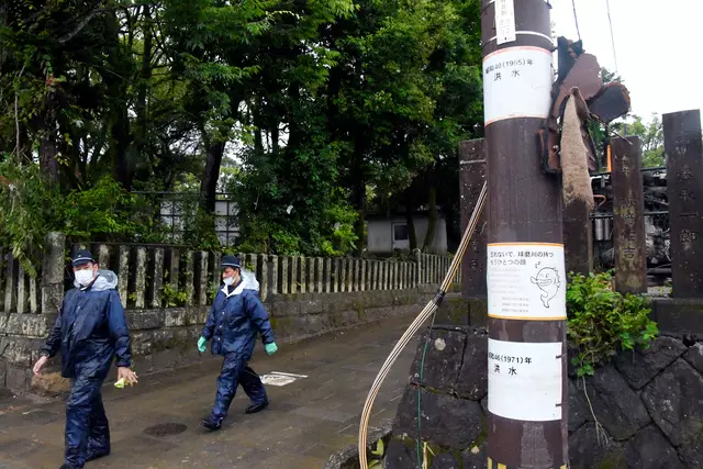 九州山地から下ってきた球磨川が潤す田畑とまちが広がる人吉盆地。その中心にある人吉市の街頭には「洪水痕跡」と書かれた標識があちこちにある。