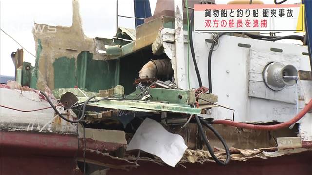 貨物船と釣り船が衝突して釣り客1人が死亡した事故で、双方の船長2人が逮捕されました。 貨物船「はやと」の船長・下鶴勉容疑者(56)と釣り船「第5不動丸」の船長・平野隆明容疑者(49)は28日、茨城県の鹿島港沖で衝突事故を起こし、釣り船の乗客1人を死亡させ、4人に骨折などのけがをさせた疑いが持たれています。第5不動丸は29日、作業船で鹿島港の岸壁まで曳航(えいこう)されましたが、右舷側の中央部分が激しく損傷していました。運輸安全委員会によりますと、貨物船の先端部分にはこすれたような傷があったということです。海上保安庁などが事故原因や経緯を詳しく調べています。