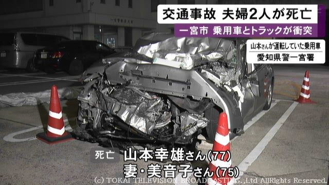 愛知県一宮市で13日午後、トラックと乗用車が衝突する事故があり、乗用車に乗っていた70代の夫婦2人が死亡しました。