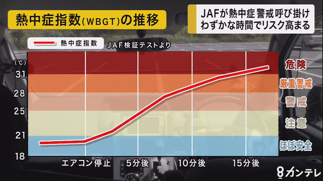 8月2日、近畿各地では30度を超える真夏日となりました。 車の中での熱中症の危険度が高まり、日本自動車連盟が注意を呼び掛けています。 これは気温35度の炎天下で、駐車中の車内の様子です。 窓を閉め切った状態でエンジンを止めると、10分ほどで車内の温度が10度以上あがっています。 日本自動車連盟=JAFによると、炎天下に駐車した車内では、わずか15分で熱中症のリスクが人体にとって危険なレベルまで高まります。 特に子供や高齢者は体温を調節する機能が弱いため、短時間でも熱中症や脱水症状になりやすいということです。 【JAF大阪支部事業課交通環境係・小山真さん】