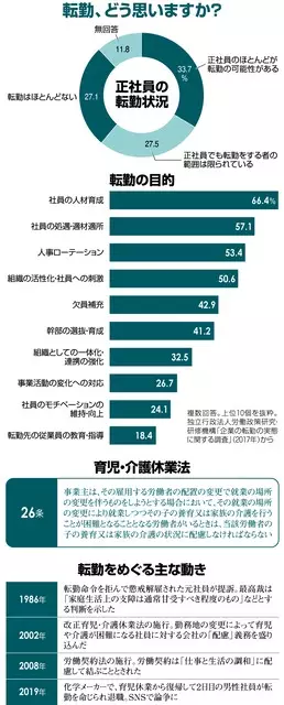春は人事の季節です。「転勤」と聞くと、心がざわつきませんか。会社が「人材育成」などとうたう一方、介護や子育てなどへの影響が大きく、頭を悩ませる人もたくさんいます。共働き家庭が主流となる中、専業主婦家庭や独身者などへの偏りも目立ちます。いまの時代になじみにくそうな転勤について考えます。