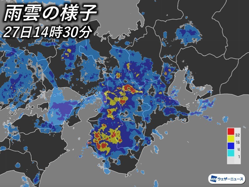 今日27日(火)は、秋雨前線に向かって流れ込む暖かく湿った空気の影響で、紀伊水道で雨雲が発達し、近畿地方に広がってきました。
