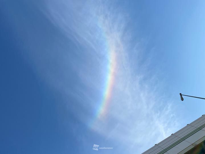 穏やかな日曜日の朝、近畿や中四国など西日本の空には鮮やかな虹色の輝きが見られました。大阪市では空の高い所に弓なりの虹が現れています。逆さ虹とも呼ばれる、環天頂アークです。太陽高度が比較的低い朝や夕方に、空の高い所に見える現象です。