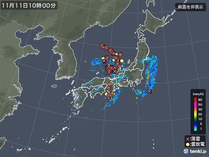 きょう11日、活発な雷雲が近畿や北陸周辺にあり、雨脚が強まっています。SNSには「ひょう」や「あられ」が降ってきたという報告が複数。この雷雲は東へ進んでいます。