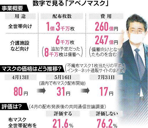 政府は「アベノマスク」とやゆされた布マスク配布を巡り、介護施設向けの追加配布を取りやめ、一部を備蓄に回す。迷走を重ね、安倍晋三政権の新型コロナウイルス対応の拙さの象徴となった事業を、数字に焦点を当てて検証した。 「全ての施設に一律に配布してきたが、現状を踏まえ、希望する介護施設等に随時配布したい」。加藤勝信厚生労働相は7月31日の記者会見でこう表明した。 介護施設向けの8千万枚の追加配布が明らかになったのは、27日。菅義偉官房長官は28日の会見で「継続配布は有意義」と訴えたが、「使い捨てマスクを入手でき、布マスクは必要ない。高機能マスクや医療用ガウンを届けてほしい」(札幌市の社会福祉法人)などの批判が噴出し、わずか4日で転換に至った。 布マスク配布は、首相周辺が「洗って繰り返し使えるので、全世帯に配れば国民の不安が消える」と進言し、4月1日に発表。「小さい」「エープリルフールかと思った」などと不評を買い、その後の共同通信の世論調査で「評価する」は21・6%にとどまった。