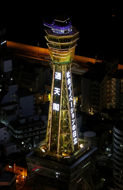 【動画】黄色にライトアップされた通天閣と太陽の塔=依知川和大撮影