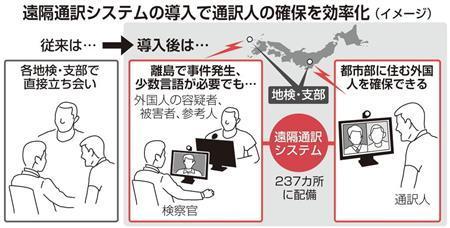 事件に関与したり巻き込まれたりした外国人に対する事情聴取や取り調べに必要な通訳人を確保しようと、全国の各地検と支部計237カ所で来年度から、遠隔通訳システムの運用を始めることが28日、明らかになった。検察の捜査現場では少数言語を中心に通訳人が全国的に不足しており、遠隔通訳システムの導入は大きな武器となりうる。専門家は「ハード面の整備は一歩進むが、質の向上や養成の仕組みをつくることも重要」と指摘する。