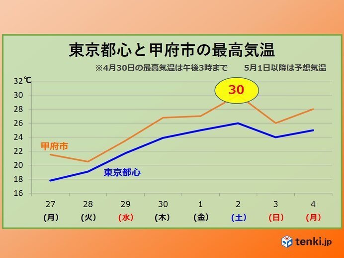 今週月曜日からの日ごとの最高気温の推移を図で見てみます。東京都心ではきょう(30日)は23.9度で、2日(土)にかけて、きれいな右肩上がりになっています。また、甲府市のきょうの最高気温は26.8度で、こちらもほぼ右肩上がりになっていて、日ごとに気温が高くなっていくのが分かります。また、そのほかの各地でも、きょうは5月下旬から6月上旬並みの気温となった所が多くなりました。