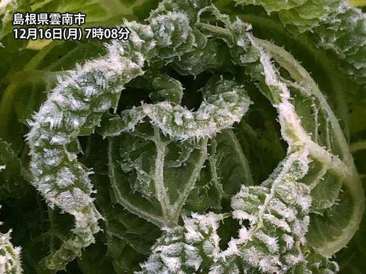 今朝7時までの最低気温は東京で2.9℃、大阪で4.2℃など都市部でも軒並み5℃を下回り、仙台は-1.9℃と6日ぶりの冬日になりました。また、この冬最低の-0.2℃まで下がった鳥取では、初霜・初氷を観測しています。いずれも平年より遅い観測です。