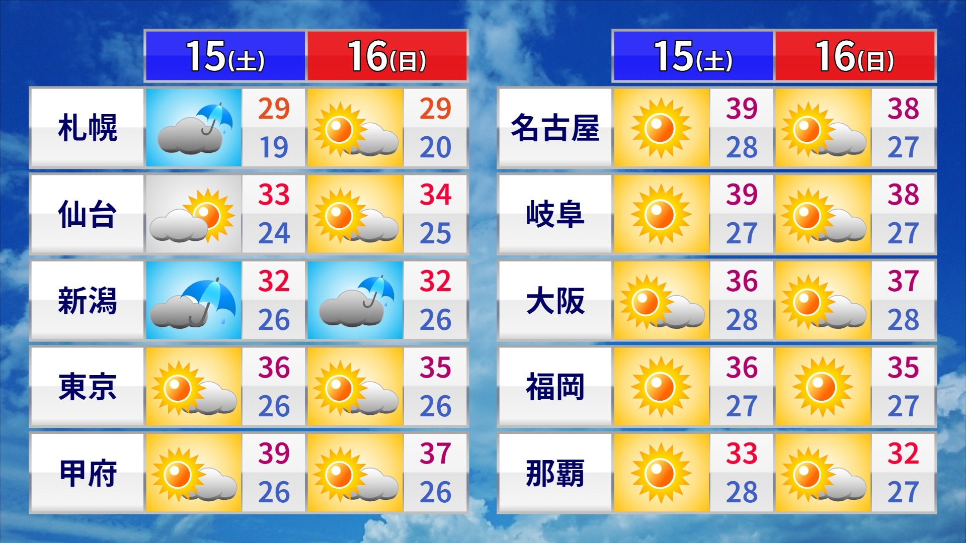 さらに東北でも35℃くらいまで上がる所があり、全国的に厳しい暑さとなりそうだ。16日(日)も同じくらいの暑さが続く見通し。