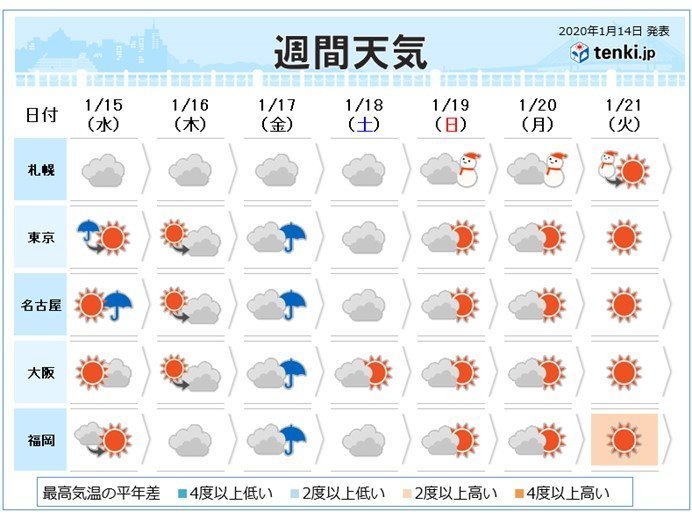 16日(木)は高気圧に覆われて、太平洋側では晴れますが、早くも西から天気が下り坂です。17日(金)は本州の南を低気圧が通過し、九州から関東は雨に。この低気圧が冷たい空気を関東など太平洋側にも引き込み、全国的に厳しい寒さとなるでしょう。18日(土)と20日(月)は、冬型の気圧配置になりますが、これも一時的でしょう。