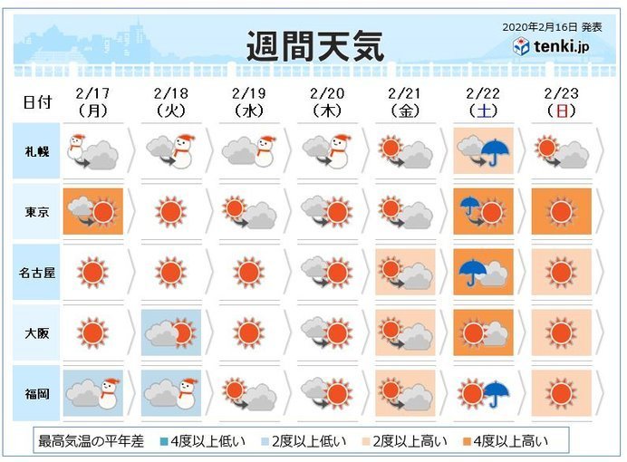 17日(月)から18日(火)にかけて、日本海側を中心に広い範囲で雪となり、大雪に警戒が必要。全国的に冷たい空気に覆われて、西日本の太平洋側でも雪が降る予想。19日(水)以降は晴れる所が多いが、22日(土)は前線の影響で曇りや雨の所が多い。