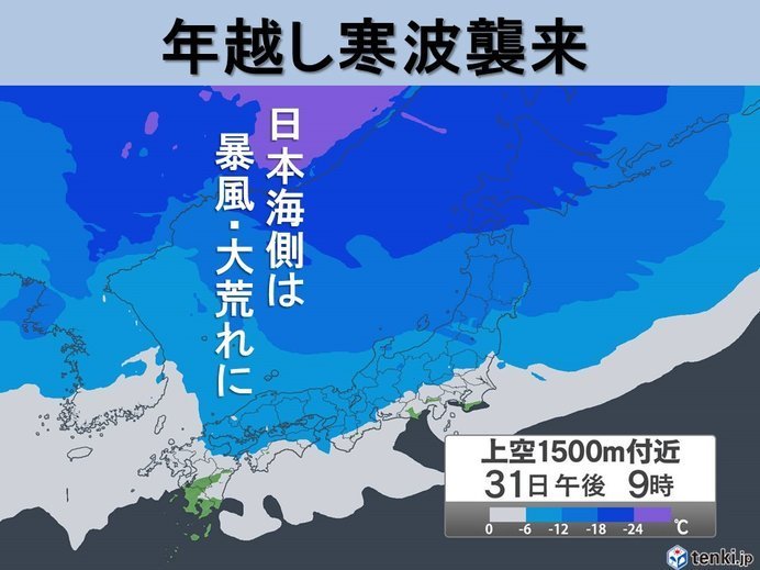 あす31日・大晦日は日本海側を中心に大荒れの天気となりそうです。前線を伴った低気圧が大晦日の朝にかけて急速に発達しながら日本海から北東に進む見込みです。冬型の気圧配置が強まり、夜には強烈な寒波が流れ込むでしょう。上空1500メートル付近で、北海道から東北付近にはー12度以下の寒気が流れこみます。また中国地方にもー6度以下という平地で雪が降る目安の寒気が流れこむ見込みです。そのため、北海道から東北の日本海側と北陸から山陰にかけて雪が降り、風が強まるでしょう。暴風や猛吹雪で大荒れとなりそうです。
