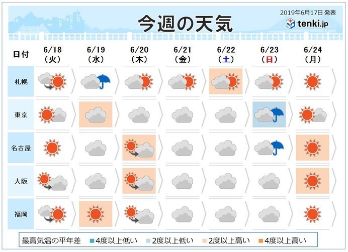 【最高気温】沖縄は28度くらいで、6月上旬並みの予想です。九州から関東は28度前後、東北は22度から24度くらいの所が多い見込みです。平年並みか、やや高いでしょう。東北北部では、7月中旬並みになる所がある見込みです。北海道は20度から22度くらいでしょう。平年より高い所が多く、真夏並みの所もある見込みです。