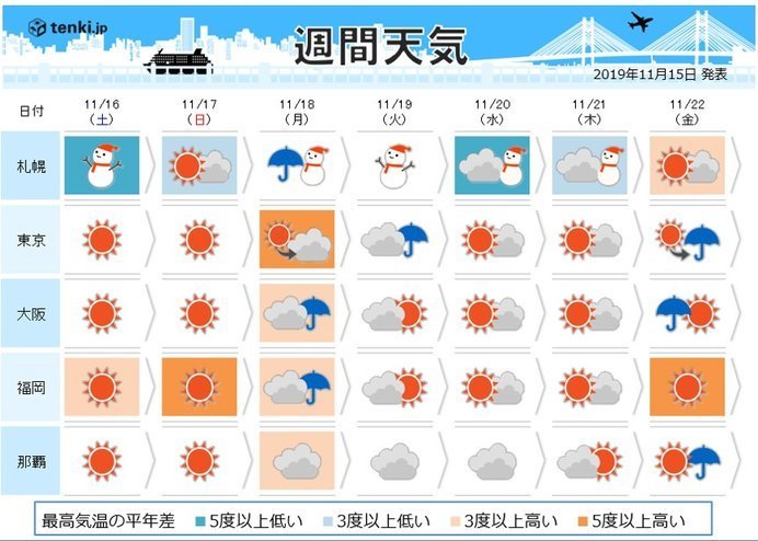 最低気温は今朝と同じかやや高いでしょう。北海道は広く氷点下、東北北部は3度前後、東北南部や北陸から九州にかけては8度前後の所が多い予想です。最高気温は、北海道は3度前後と厳しい寒さが続きます。東北は10度~13度くらいと、こちらも空気が冷たいでしょう。北陸は15度前後で、雨の冷たさが加わって、体感温度はさらに下がりそうです。関東から中国地方は18度前後、四国と九州は20度~23度くらいで、日中は過ごしやすいでしょう。沖縄は26度前後の予想です。