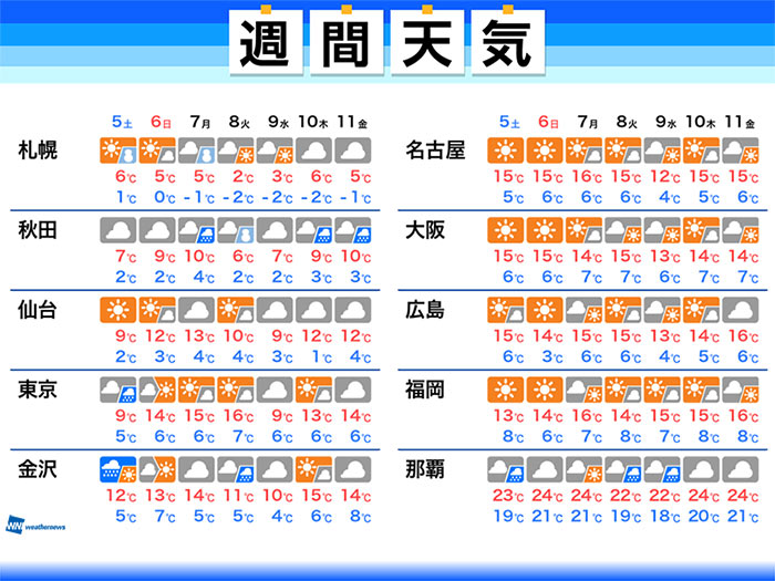 特に明日5日(土)は関東南部を中心に弱い雨が降り、冷たい北東からの風も吹くため、昼間も10℃に届くかどうかと寒くなる見込みです。本格的な冬のアウターなどが必須となります。 来週は周期的に晴れるので、洗濯物の外干しなど日差しの活用をすると良さそうです。曇りの日は大掃除もおすすめです。